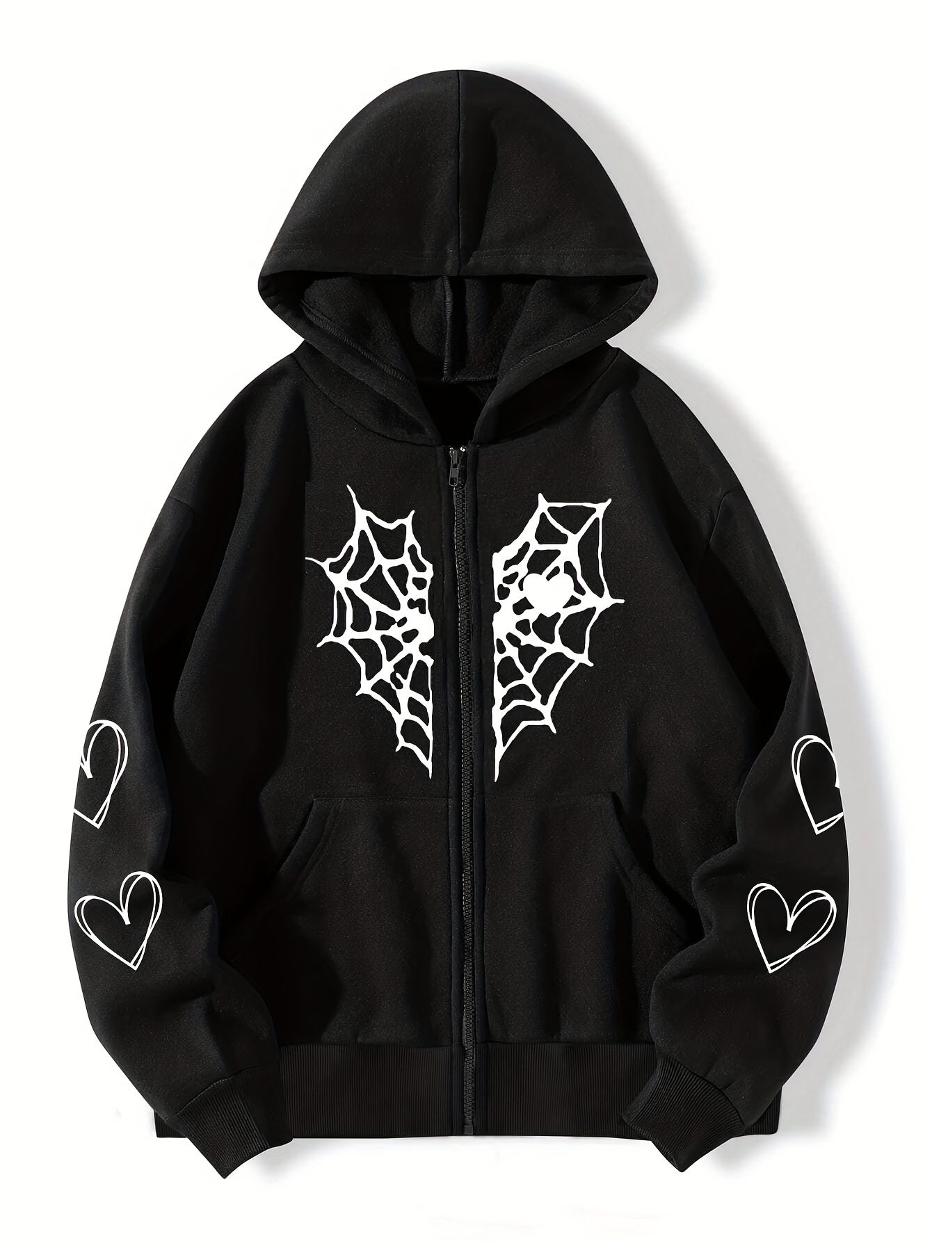 Spider Web Heart-shaped Print Drawstring Loose Hoodies, Casual Zipper Hooded Pocket Fashion Long Sleeve Sweatshirt, Women's Clothing