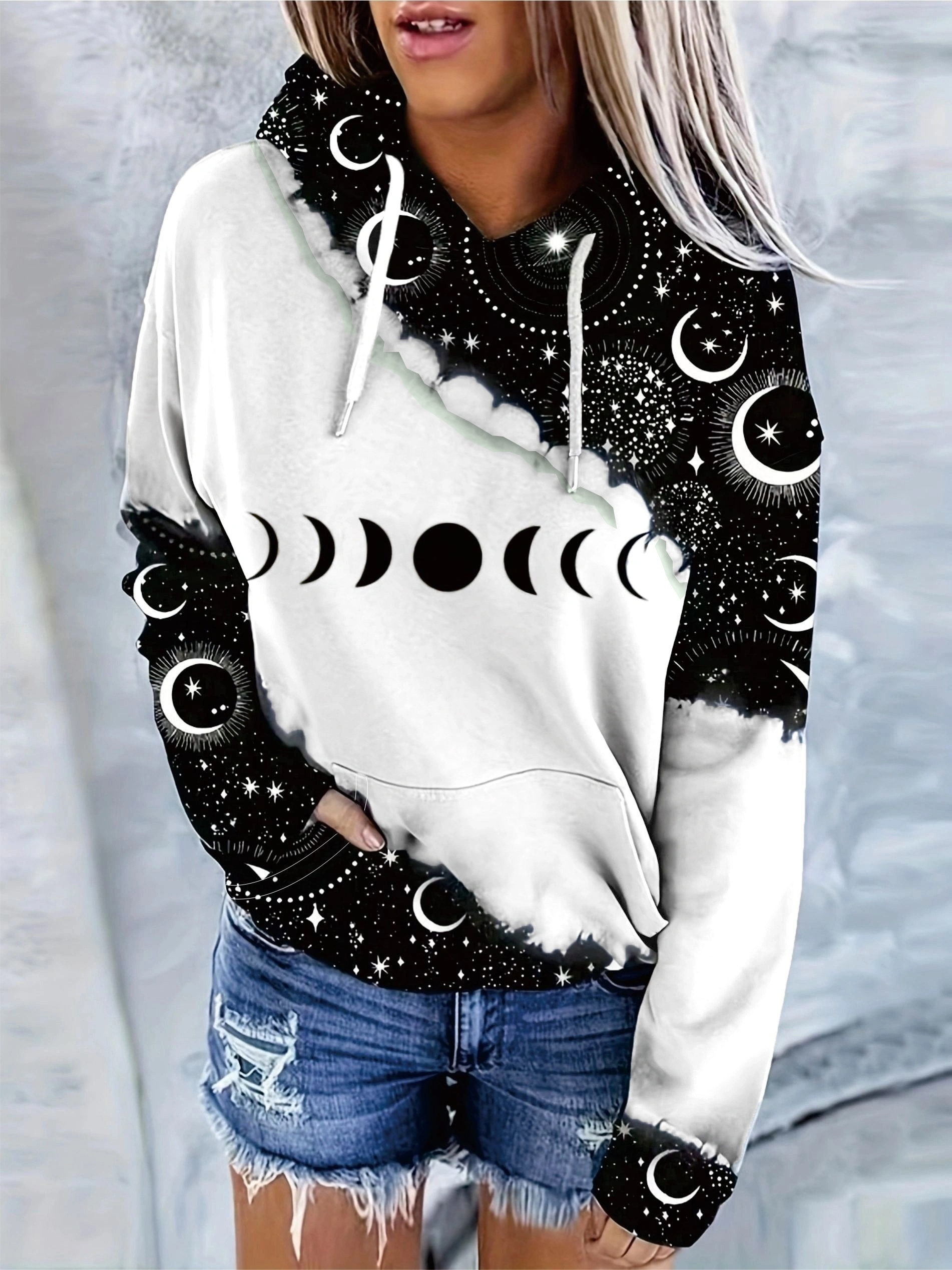 Color Block Moon & Star Print Drawstring Hoodie, Casual Long Sleeve Kangaroo Pocket Hoodie Sweatshirt, Women's Clothing